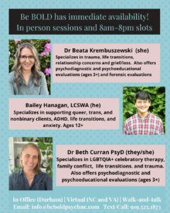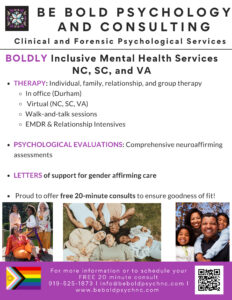 Be BOLD Psychology and Consulting is a queer- and woman-owned, trauma-informed, LGBTQIA+ celebratory, and neurodivergent-affirming mental health practice serving individuals, couples, families, and communities across North Carolina, South Carolina, and Virginia. We offer both in-person therapy in our Durham office and telehealth sessions across several states, making care accessible and flexible for your needs.